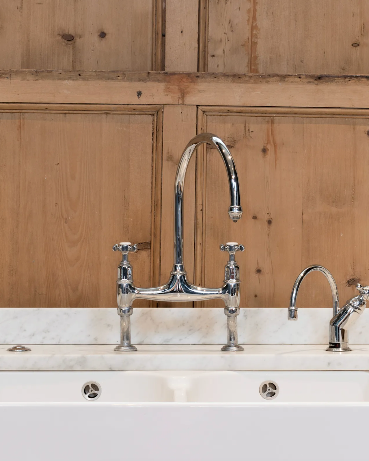 철은 단단하고 차가운 분위기를 지니지만, 다른 물성의 재료들과 만나면 놀라울 만큼 다양한 하모니를 이룬다. 철은 거칠고 원초적인 무드부터, 수수함과 세련됨, 그리고 우아하고 새침한 느낌까지 더할 수 있는 재료다. 나의 경우 타일이나 원목, 유리와 어우러져 주방이나 욕실의 우아한 분위기를 내고 싶을 때 반짝이는 거위 목 수전을 사용한다. 격자창과 도자기 조명이 어우러진 카페 주방에 이런 곡선 수전을 설치하면 주변의 따뜻한 분위기의 요소들과 거위 목 수전의 새침한 반짝임이 어우러져 눈길을 끈다.