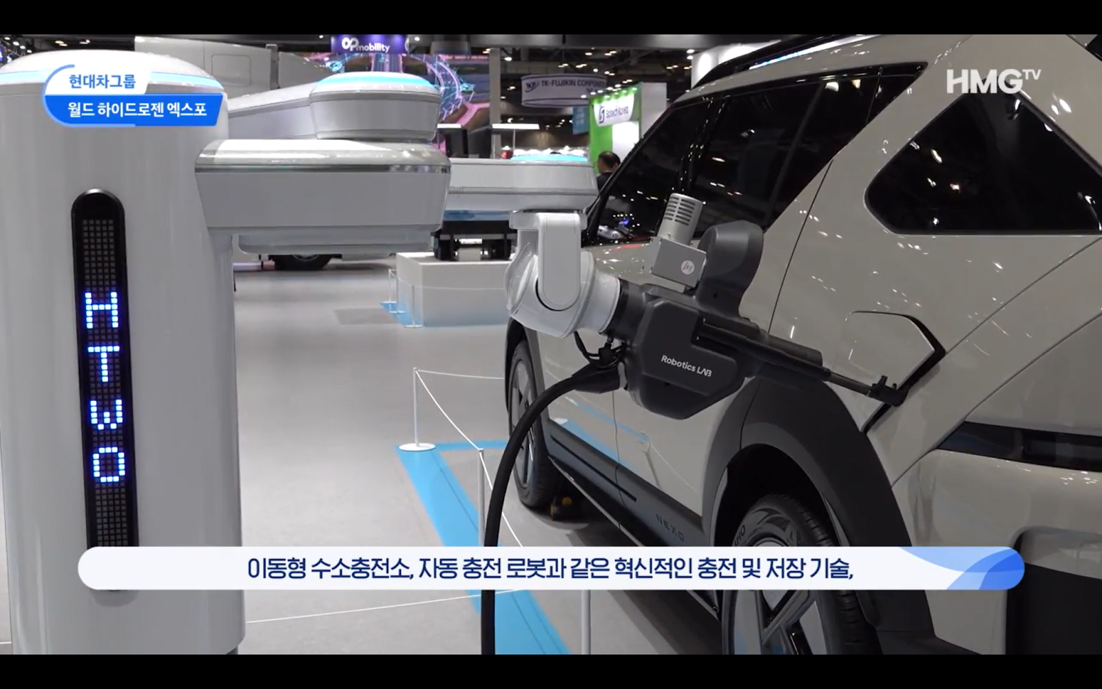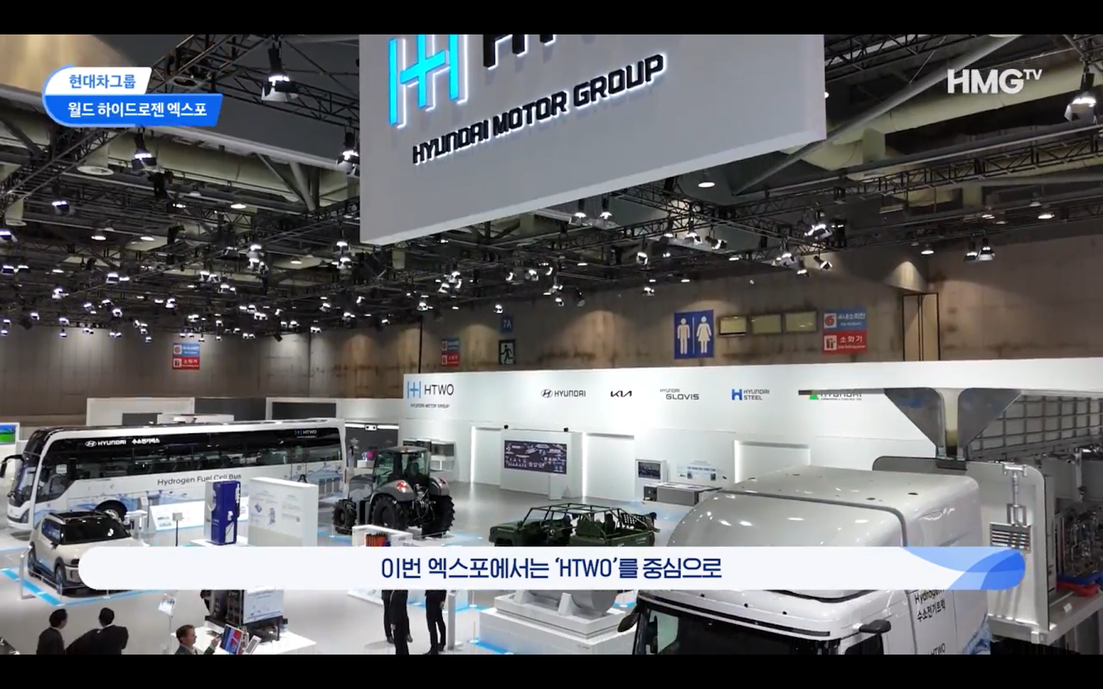 이번 엑스포에서는 그룹의 수소 비전인 'HTWO'를 중심으로 현대제철, 현대차, 기아 등 총 7개 그룹사가 함께 공동 전시 부스를 마련 했습니다. 이는 수소 생산, 저장, 운송, 활용에 이르는 수소 밸류체인 전반에 걸친 그룹사의 통합된 기술력과 사업 역량을 한눈에 보여주기 위함이었죠.
