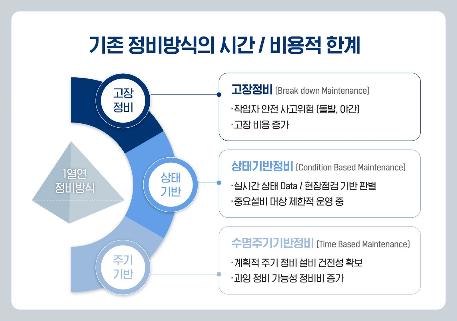 예지정비가 도입되기 전에는 고장이 언제 날지 몰라 새벽이나 주말에도 갑자기 출근해야 하는 일이 많았습니다. 또 부품의 실제 상태와 상관없이 일정 시간이 지나면 무조건 교체해야 하는 TBM(Time Based Maintenance) 방식 때문에 비용 부담도 컸습니다.