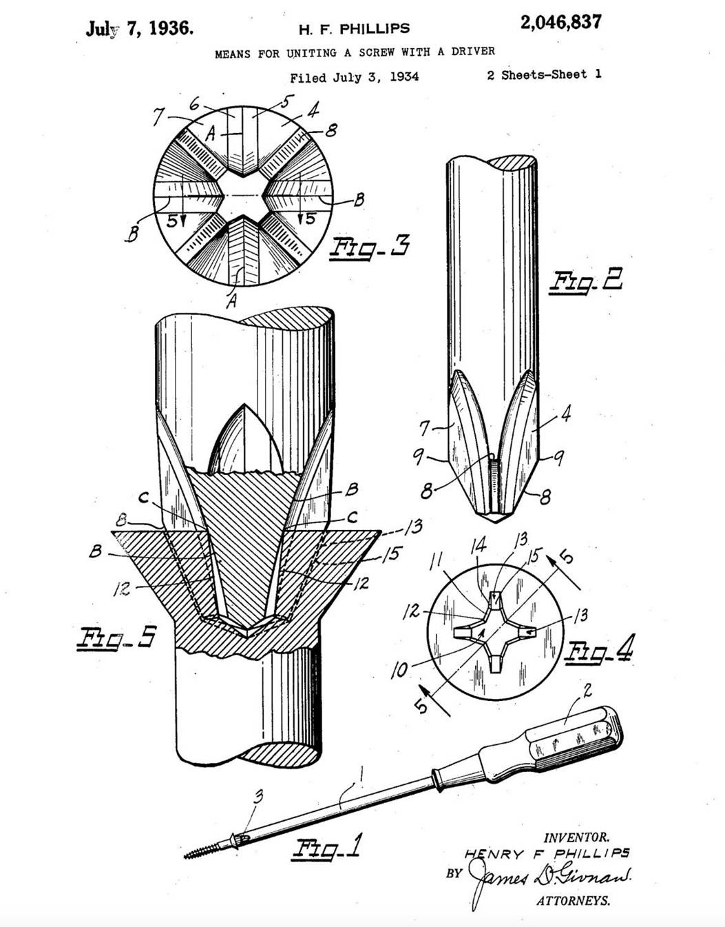 헨리 F. 필립스가 제출한 십자 드라이버와 나사의 도면(미국 특허 US 2,046,837-1936). 십자 형태로 깎인 드라이버의 날끝이 나사 머리 속 원추형 공간에 맞물리도록 설계되었다.