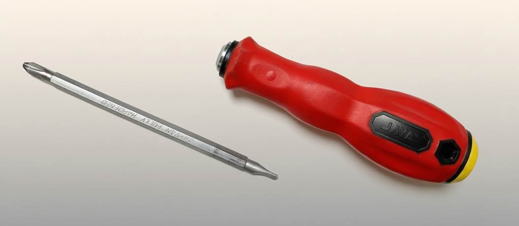 드라이버 비트를 손잡이에 끼워 쓰는 양용 드라이버. 한쪽은 PH2 십자 드라이버, 반대쪽에는 일자 드라이버 팁이 있어 원하는 방향으로 사용할 수 있다.