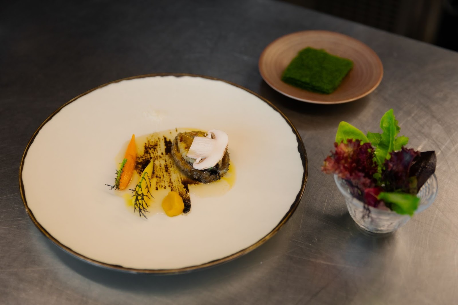 원래는 메인 재료로 한우나 생선 구이를 쓰는데, 오늘은 좀 더 태안의 요리로 표현하고 싶어서 전복으로 바꿨어요. 소스도 전복에 맞춰 조정했고요. 나머지 곁들이는 퓨레, 샐러드, 당근 등의 요리 구성은 똑같습니다.