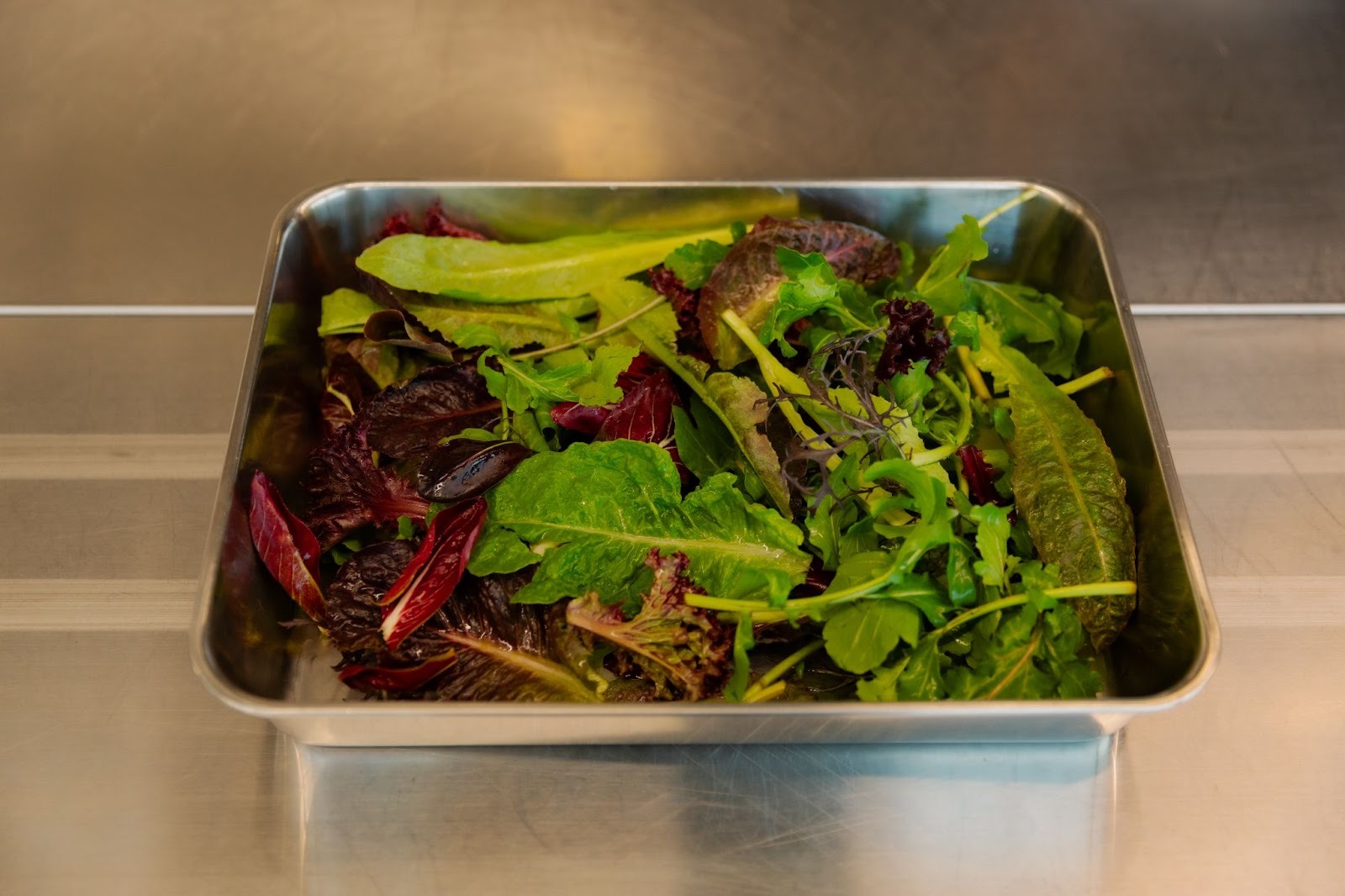 오늘 샐러드에는 모크잎, 로메인, 청상추, 레드프릴, 루콜라 등이 들어갔어요. 사실 더 다양한 채소가 있는데, 지금은 날씨가 추워서 성장이 느려요. 봄이나 여름이 되면 더 다양한 허브들이 자라서 훨씬 풍성한 샐러드를 만들 수 있죠. 지금은 포포 농장의 겨울 채소들 위주로 구성했습니다.